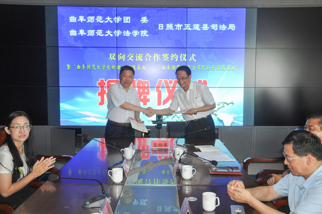 7月12日上午,我校团委、法学院与五莲县司法局举行双向交流合作签约仪式暨“365bet体育在线平台生命教育实践基地”、“365bet体育在线平台法学院社会实践基地”揭牌仪式。法学院党委书记曹明亮,校团委副书记刘蓉,法学院党委副书记卢瑞霞,日照市司法局党委委员、副局长刘书荣,五莲县政府副县长、公安局长史文明出席签约仪式。仪式由五莲县司法局局长王文华主持。