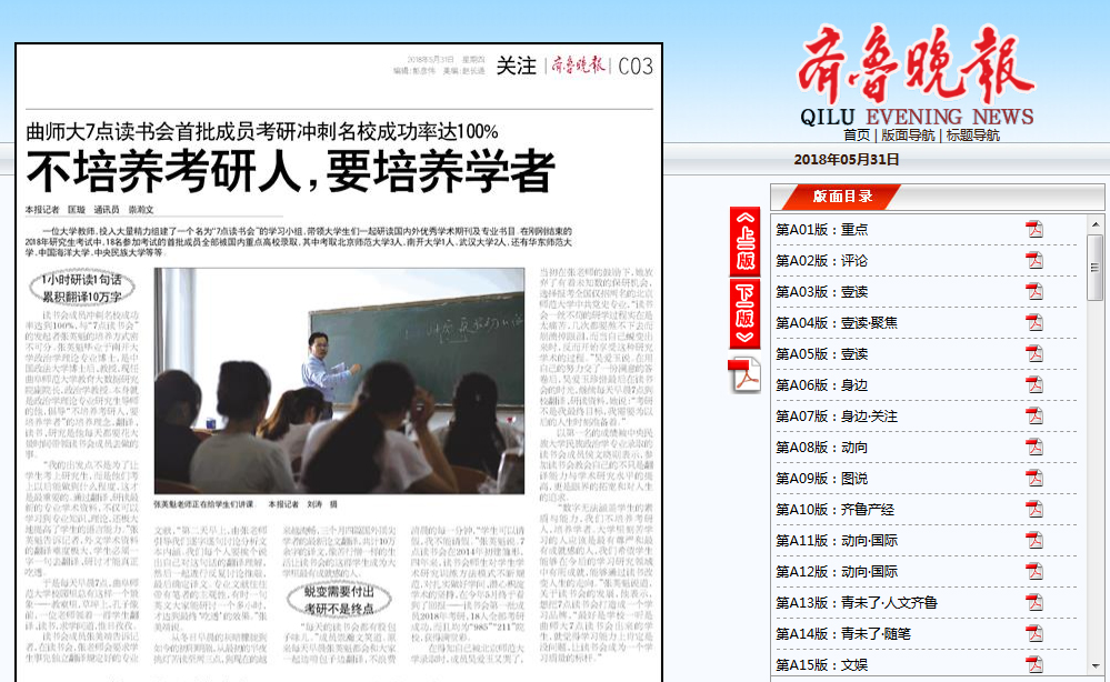 齐鲁晚报:曲师大7点读书会首批成员考研冲刺名校成功率达100%